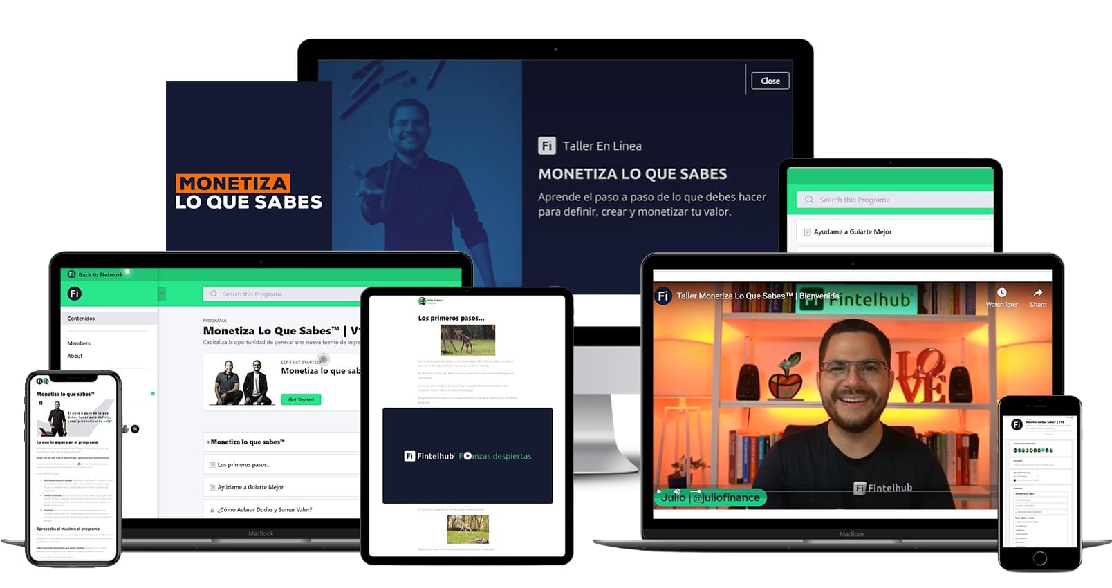 Te ofrecemos un entorno de aprendizaje agradable y entretenido, conacceso al equipo Fintelhub™ para consultas y pertenecer a una comunidadde personas que al igual que tú quieren superarse y tener bienestarfinanciero mientras dejan una huella positiva en el mundo con su legado.